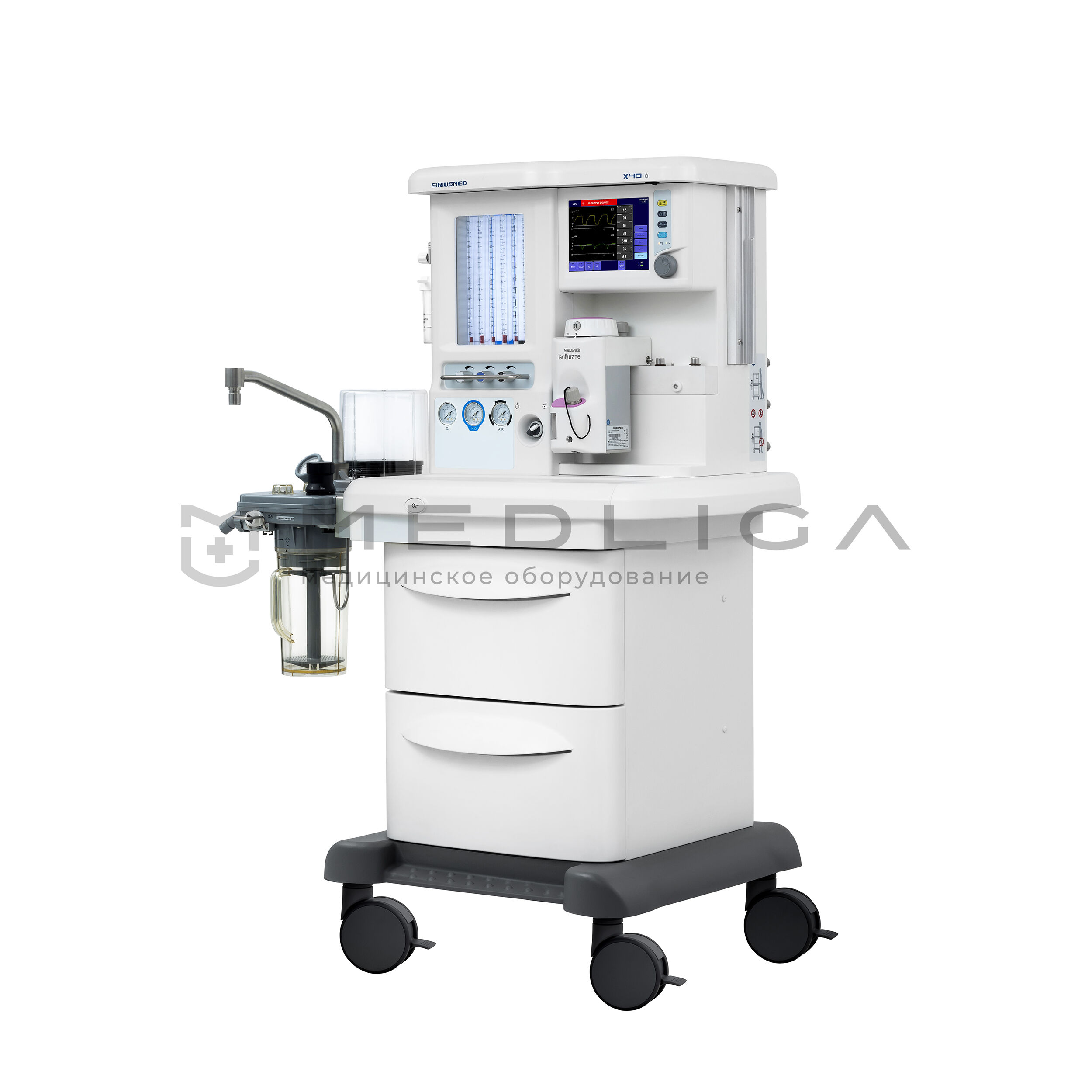 Тележка. Базовая комплектация уже имеет расширенную комплектацию для работы анестезиолога. Трехгазовая версия (О2, AIR, N2O). База на два испарителя Selectatec Interlock. Рельсы с обеих сторон для крепления монитора пациента и ПК. Крепление для двух резервных баллонов О2 и N2O. Три встроенные медицинские розетки 220В для дополнительного оборудования. Светодиодная подсветка рабочего столика и механических ротаметров. Центральный тормоз фиксирует все 4 колеса одной педалью. Подставка для ног врача. Встроенная батарея на 90 минут. Два вместительных выдвижных ящика. Встроенные порты VGA и USB.