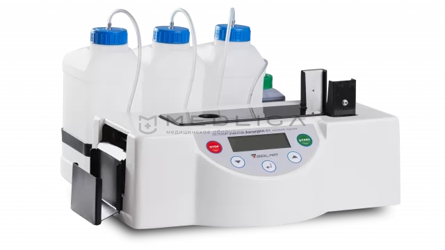 Автомат окраски мазков крови АвтоОМК-01 применяется в медицине и ветеринарии. Трудоемкий процесс ручной окраски мазков крови становится удобным и высокопроизводительным